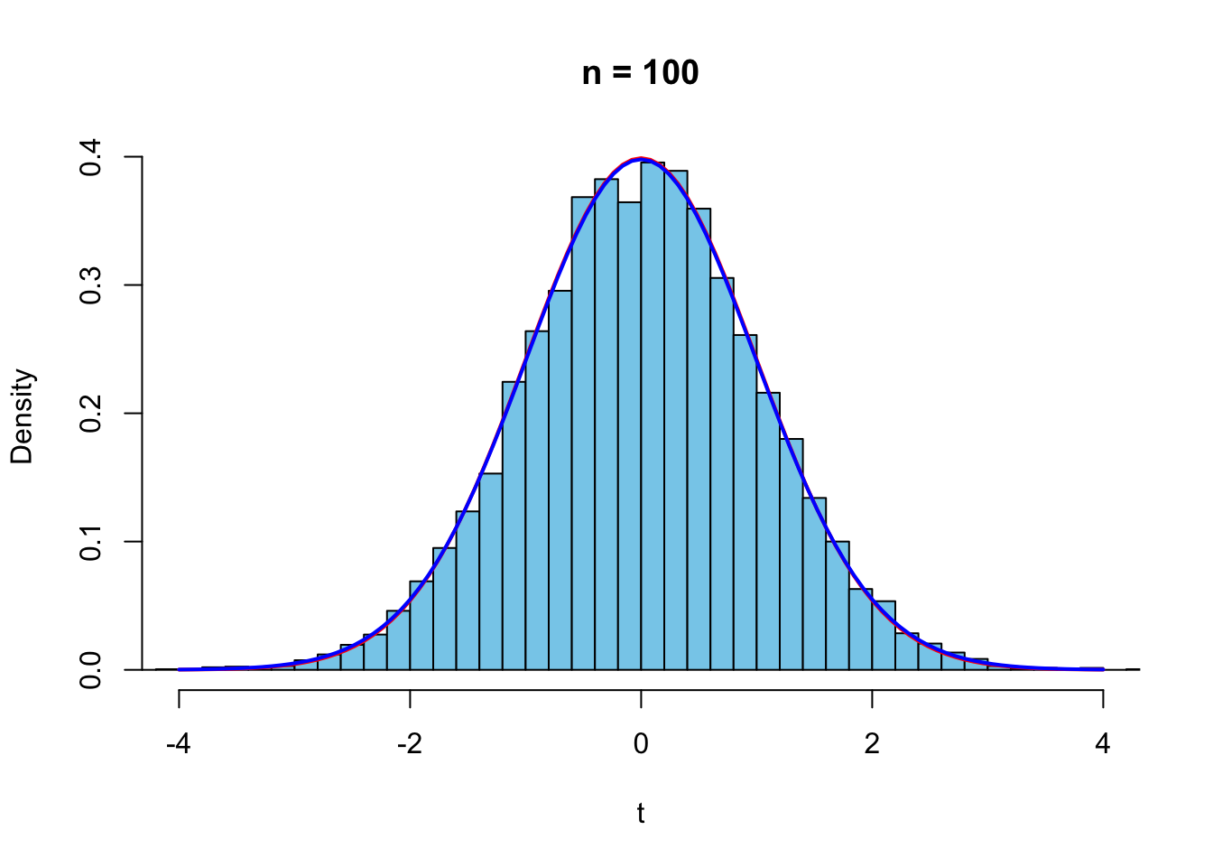 curve(dt(x,n-1),-4,4,col="blue",lwd=2,add=TRUE)