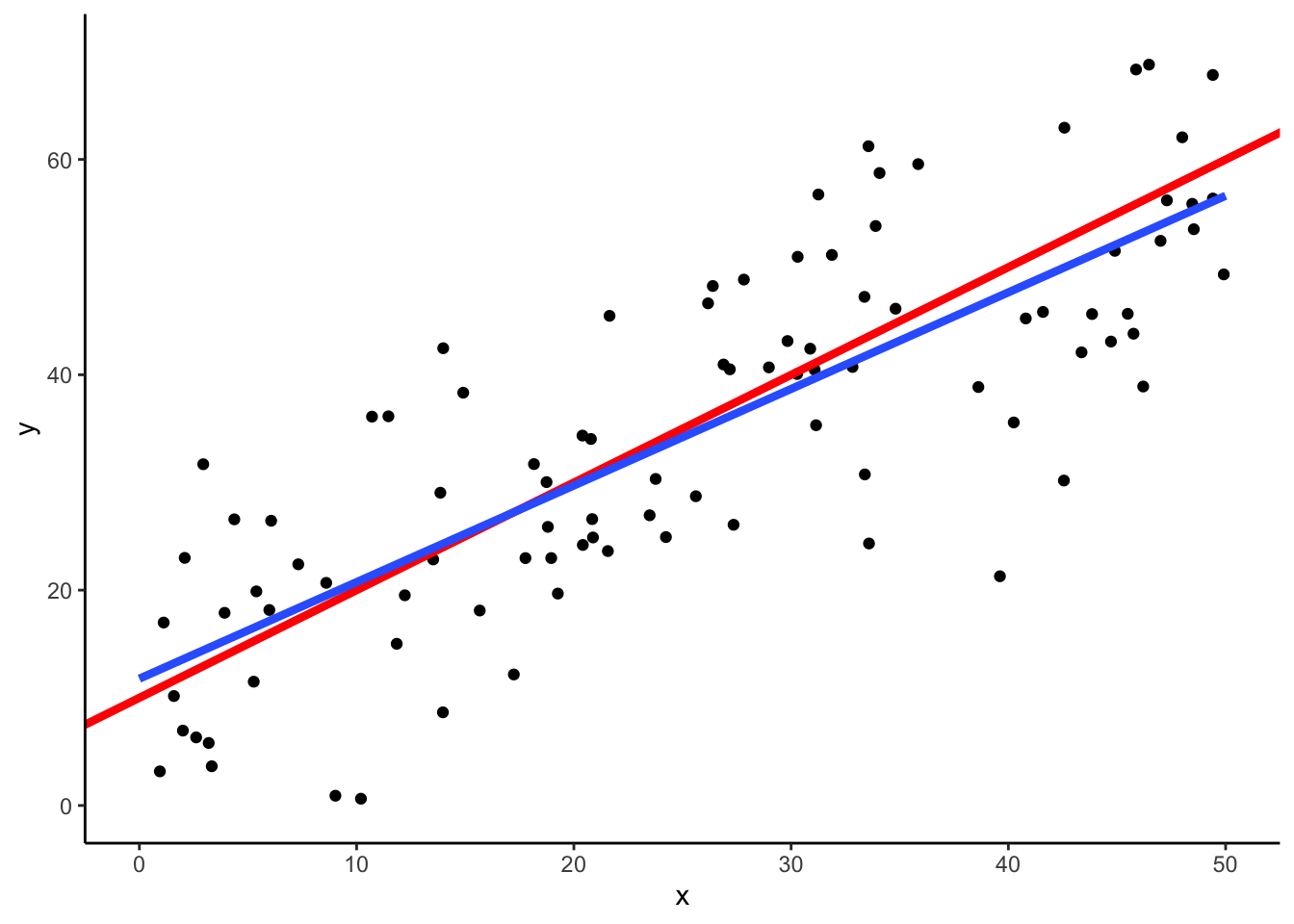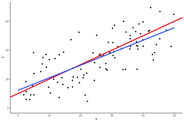 赤線が\(y=x+10\)で,青線はデータから推定された回帰直線である.青線が完全に赤線に一致していれば正しい推定がなされたことになる.普通は若干のずれがある.
