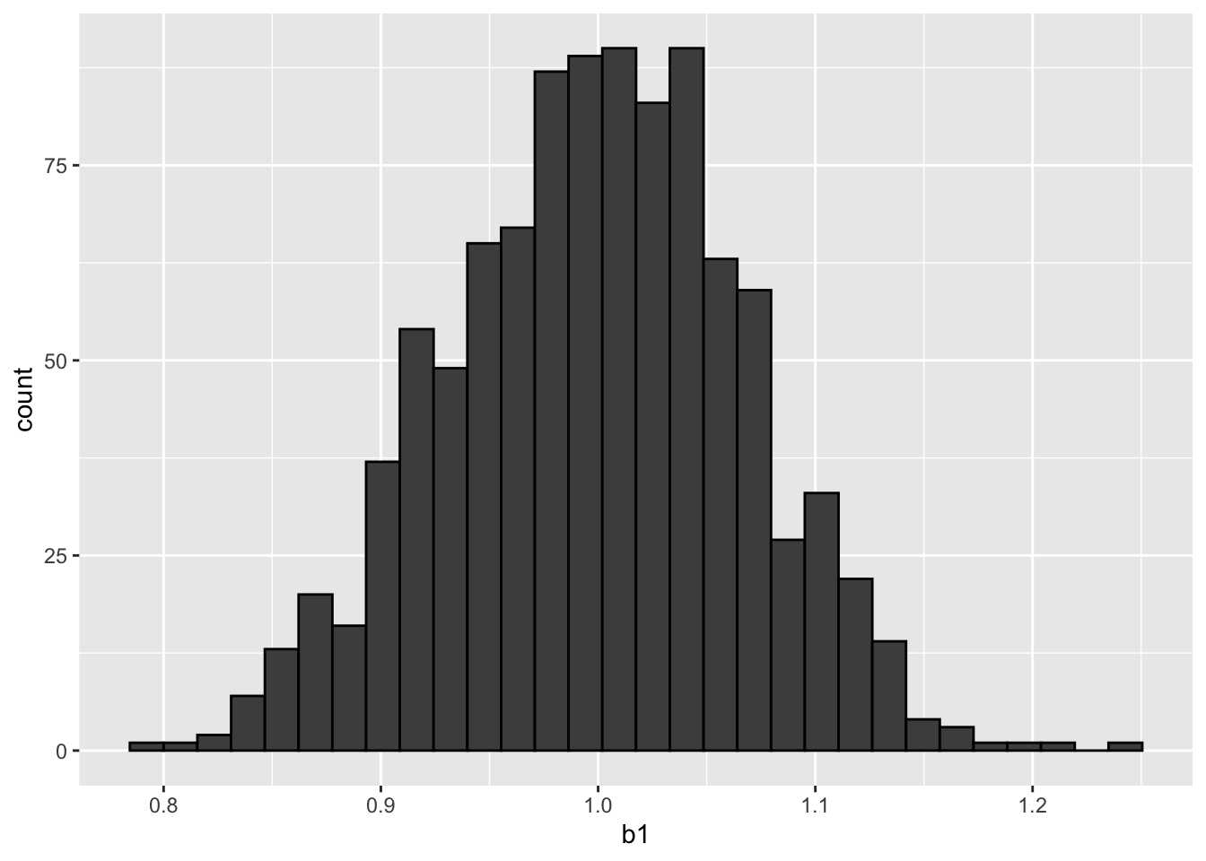 \(b_1\)は真値の1を中心とした分布となる.\(b_1\)の平均と標準偏差は次の通り.