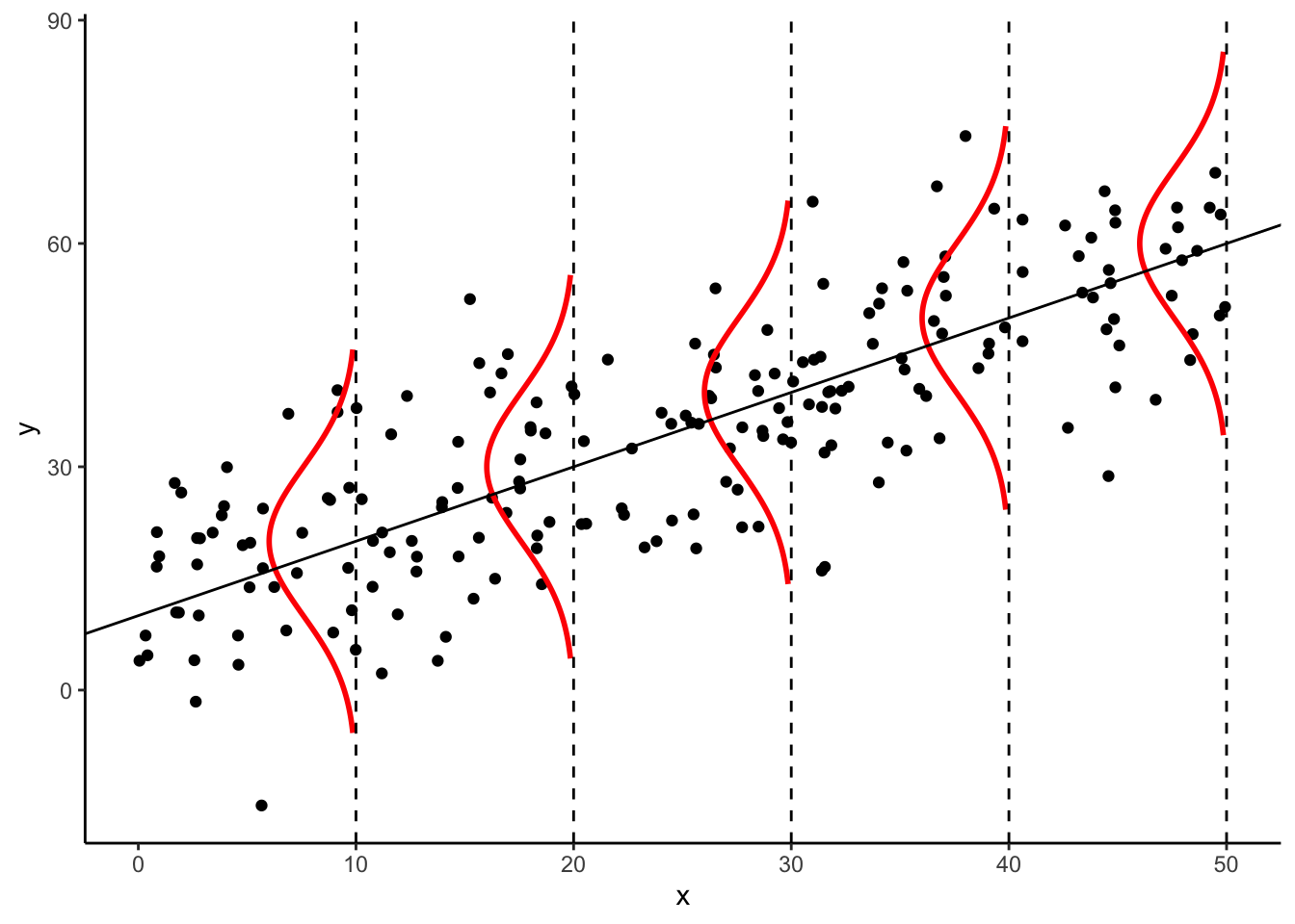 以上の仮定を図解すると下図のようになる.母集団分布は赤色の正規分布であり,\(x\)のレベルで平均パラメータが動く(本当は,分布の赤い線は\(x\)のレベルに応じてぎっしり詰まっている.カマボコを上から俯瞰することを想像せよ).ただし,分散は\(x\)のレベルで変わらない(分散均一性の仮定).そして,実際の散布図データは,この母集団分布からランダムに抽出されたものである(カマボコをぶるんぶるんしたら,黒いボツボツがふぁらーと落ちてくるみたいなイメージ).
