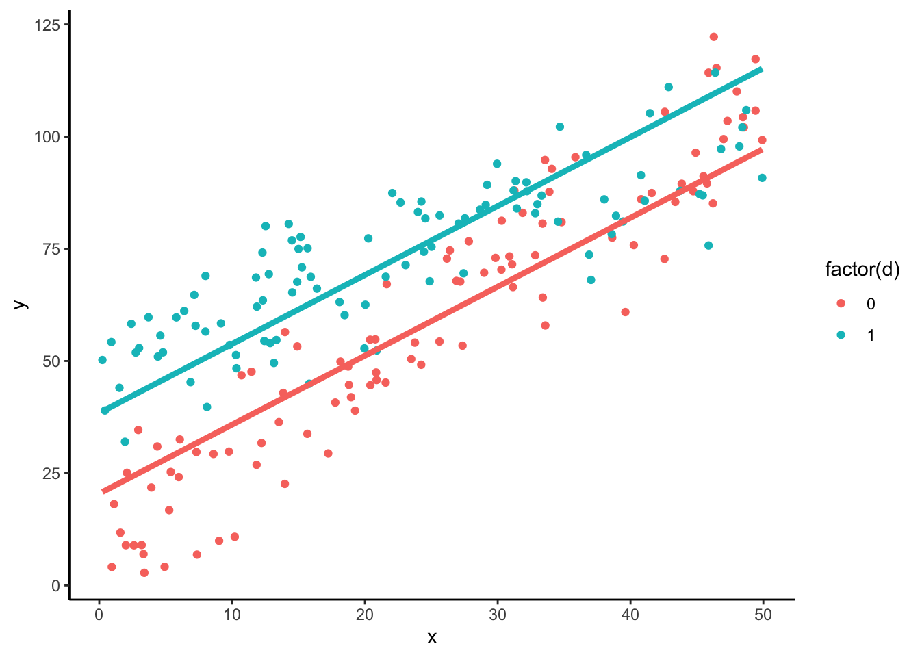 \[ \hat{Y} = 20.45 + 1.54 * x + 17.97 * d \] ここから,\(d=0\)の時の切片は20.45,\(d=1\)の時の切片は\(20.45 + 17.97 = 38.42\)と推測されていることがわかる.