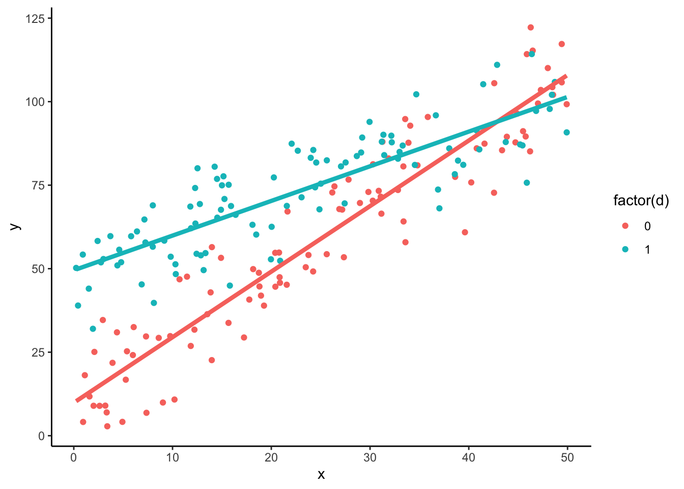 \[ \begin{align} d = 0 :\ & Y = 9.87 + 1.96 * x \\ d = 1 :\ & Y = 49.53 + 1.04 * x \\ \end{align} \]
