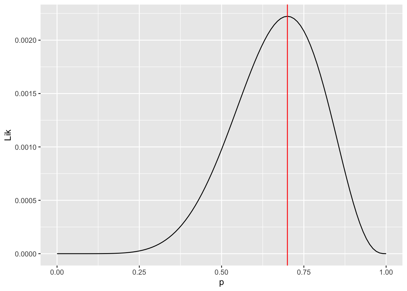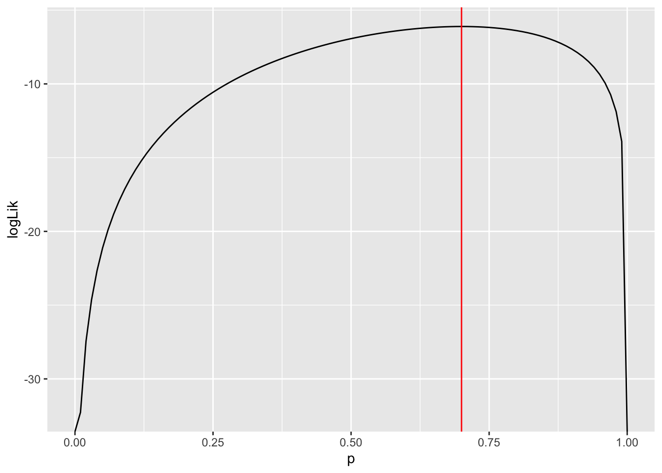 母数\(p\)の尤度関数・対数尤度関数は以下のようになる. \[ \begin{align*} L(p)&= p^7(1-p)^{3} \\ \log L(p)&= 7 \log p + 3\log(1-p) \end{align*} \] \(p\)の最大化問題を解くと以下を得る. \[\begin{align*} p=\frac{7}{10}=0.7 \end{align*}\]
